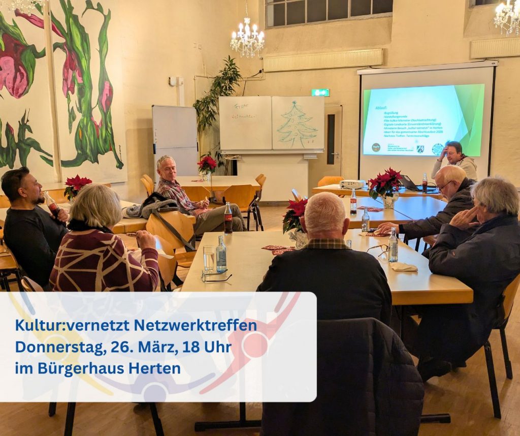 Am Donnerstag, 26. März, treffen sich um 18 Uhr kulturaktive Hertenerinnen und Hertener im Projekt „Kultur:vernetzt“ in den Räumen des Vereins „Förderwerk Herten e.V.“ an der Ewaldstraße 15, um unter anderem den Kultur-Kilometer 2026 vorzubereiten.